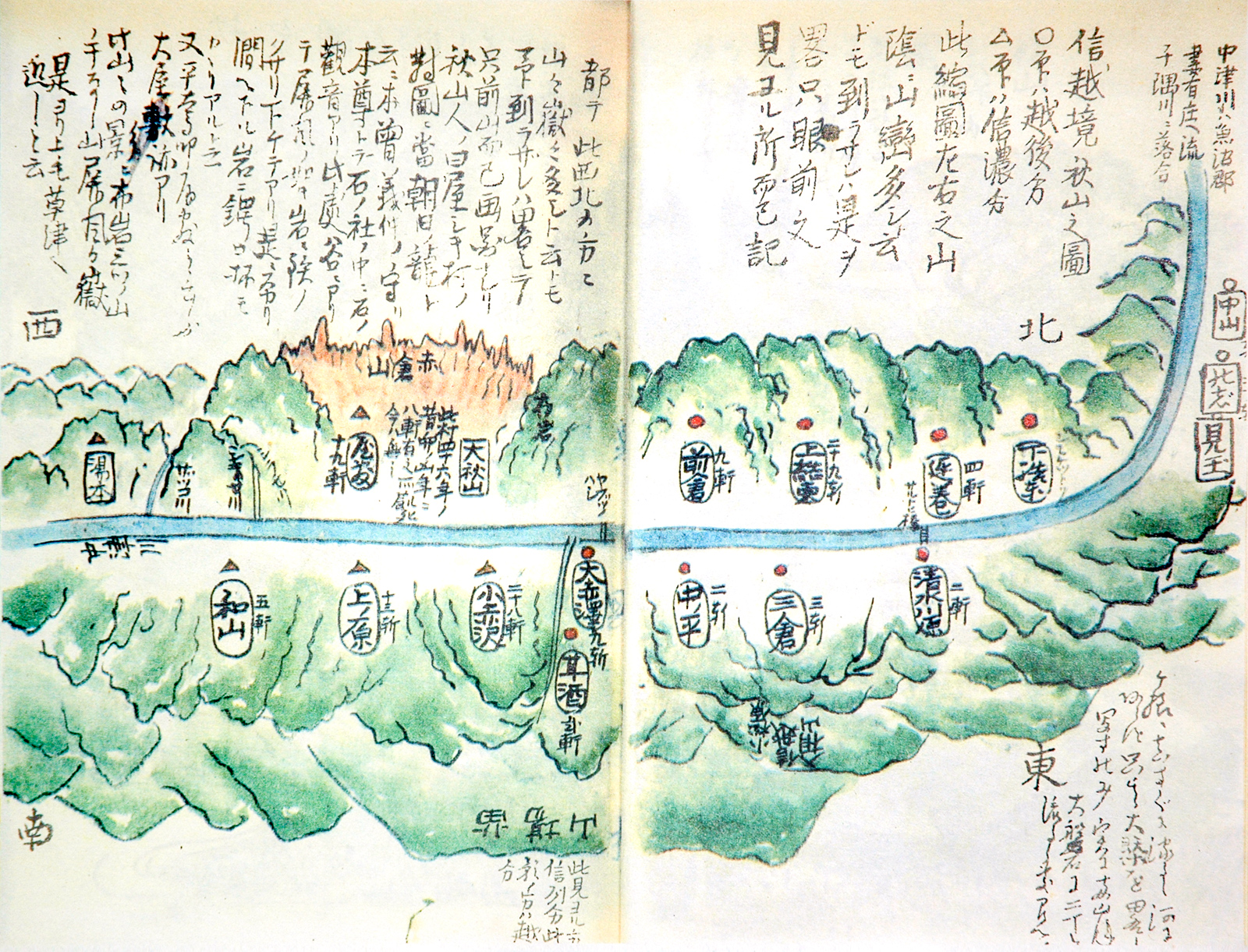 この絵図に書き込まれている村々には、当時の戸数が書かれている。また、拡大したが(拡大図1~4)、サルトビバシ、ヤビツバシ、シラセ川・ザッコ川の記述が読み取れる。絵図の正面観は苗場山から見た秋山郷の視点であるが、拡大図4は反転しており、そこには「天相山・信越・小松原」の記述が読み取れる。