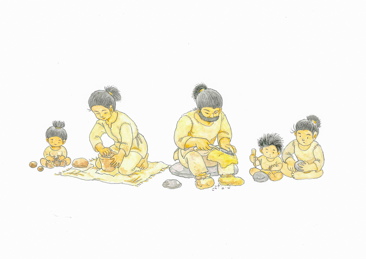 ここでは道具つくりの技術とその所作の伝承システムを考えた。図1は、両親から子供への技術伝承が描かれている。しかし昼間、若い男性はムラのソトへ狩猟や粘土採集、女性も植物採取や雑魚取りをしていたと推測され、昼間のムラでは老人層が子供を集めて、遊びを通して道具や材料を触ることから始め、道具つくりを傍らで見よう見まねの模倣ごっこ、現代的には「ままごと」や「おいしゃさんごっこ」なども遊びから所作を学ぶ役割がある。