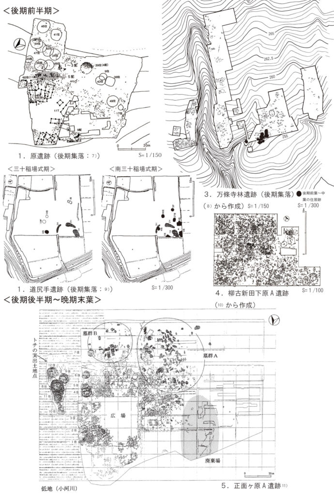 崖線から湧き出る大清水の豊富な水が流れる小川の岸辺に竪穴住居群がまとまって検出された。集落全体から見るならば東端に当たる場所である。右岸の竪穴住居群が立地する平坦面は、小川の流れに近接する。左岸の住居跡群が位置する段丘端部と小川の比高は... -