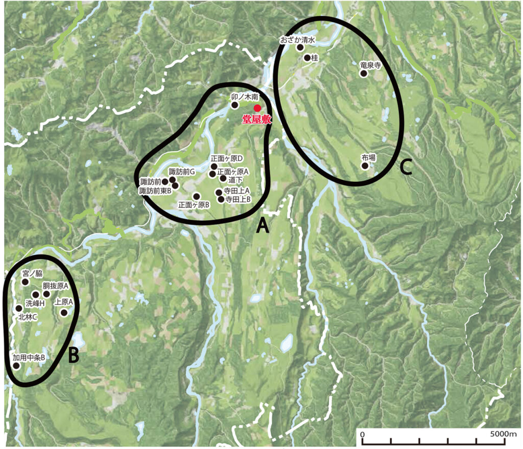 苗場山麓に分布する晩期遺跡は、21ヶ所確認されている。その分布(第1図)を観察するならば、河川を分離境界として3つのエリアが確認できる。正面ヶ原A遺跡が立地する清津川以西から中津川以北に11ヶ所の遺跡が偏在するエリア1がある。エリア1は、A群:... -