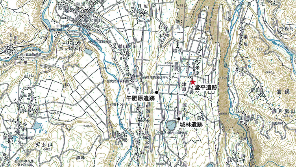 堂平遺跡は、苗場山麓の中期を代表する遺跡である。火焔型土器を作り、それ以降、後期中葉まで継続時間の長い集落跡である。標高約450mの高位段丘面に位置するが、高地の苗場溶岩流から湧き出る水を源にする稲荷川が近接地に流れる。遺跡周辺には、これ... -