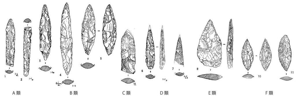 石材原産地に近い遺跡地には、在地石材を草鞋形やハンバーグ形に近似した形態や、両面粗割り加工したブランク(母形)の状態で搬入される特徴がある。そのブランクから尖頭器(石槍)が製作され、形態は芹沢長介によって6形態(A類~F類)に分類されている... -