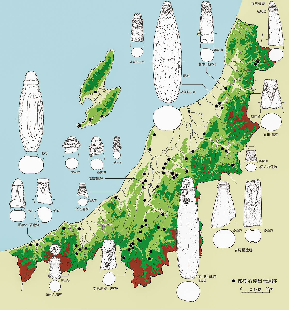 この彫刻石棒の仲間は、北陸地方に分布する(第2図)。富山県氷見市大境洞窟遺跡出土の彫刻石棒は、亀頭下端部が膨らみ環状化し、その上下に三角形(三叉文)の文様が彫り込まれる。この亀頭部を「男性原理」と読み解き、上下三角の陰彫りを「女性原理」と考え、その「両性具有」の崇拝遺物との理解がある。例えば、その三角形(三叉文)に注目するならば、芋川原遺跡の環状突帯の下に二股に分かれる「y」字状文様の浮文の中が三叉文にあたる。やはり、このマジカルな記号文様には、石棒の亀頭部と絡む意味があるのであろう。