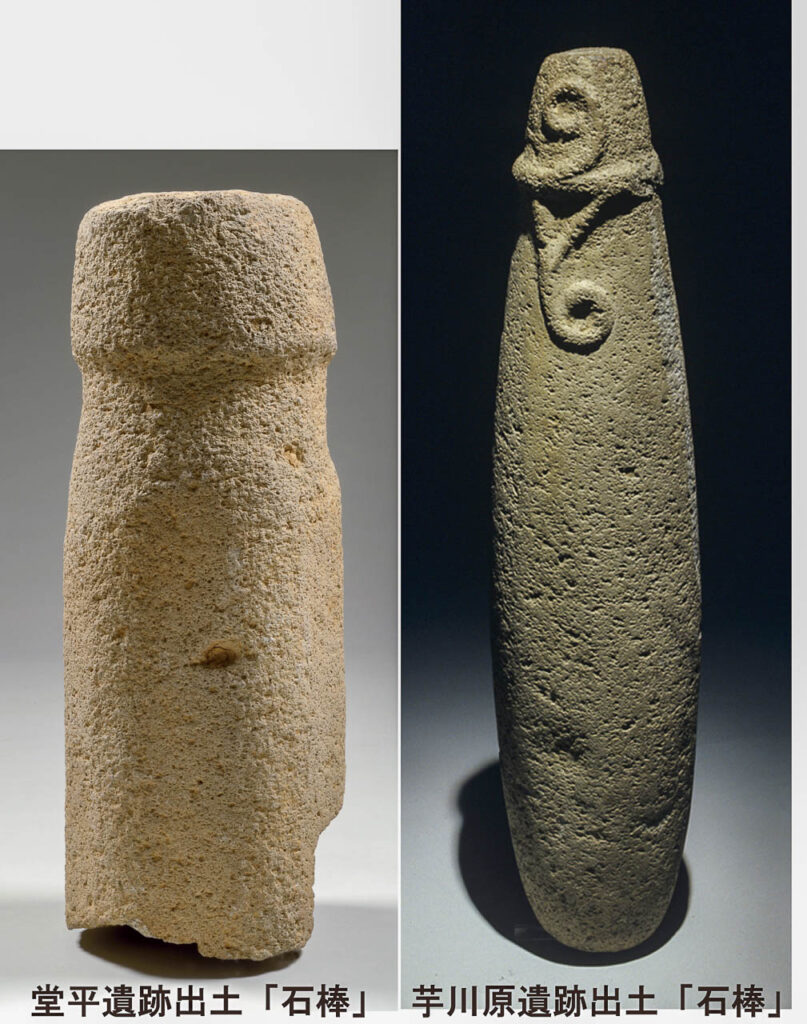 さて、石棒のイメージにあった母岩の採集からはじまり、その形あるいは文様を想定しながら、剥離というよりは叩きつぶす「敲打技術」で造形する。最終的には、一部研磨技術が採用され磨かれる。堂平遺跡例の胴部を観察すると柱状節理の母岩であったなごりが認められる。一方、芋川原遺跡の事例は、全国的にも重要な資料である。亀頭下端部の環状突帯を浮き彫りする。その環状突帯と連結する上下二つの文様が浮き彫りされている。このマジカルな文様は、土器文様との整合性がある。言い換えれば、文様には「マジカルな記号」的な意味があったと石棒との関係から推測される。さらに興味深いのは、土器の大半は正面観の判断が付かないが、この彫刻石棒は文様が浮き彫りにされている部位が一箇所であることから、そこに正面観があったのであろうと推測したい。
