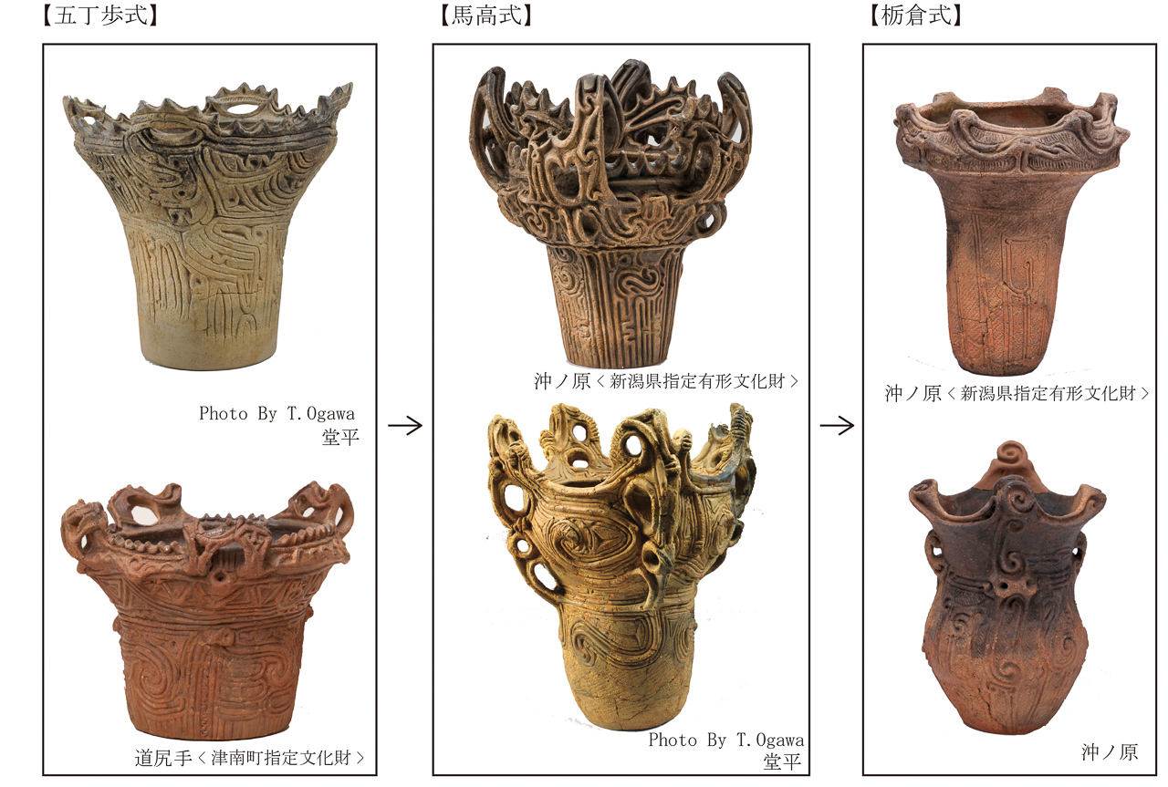 五丁歩式土器-馬高式土器-栃倉式土器は、「渦巻き」の文様という大きな共通項があり、その雰囲気が似通っていることから、その全体を「火炎土器様式」として理解する場合もある。