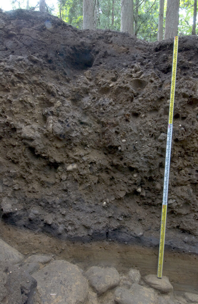 その後の地形・地質調査の結果から、ニセロームは信濃川対岸の真山が山体崩壊した際に堆積した崩壊堆積物であることが判明した。その年代は、下位段丘面黒土出土の炭化物(約14,000年)よりも新しい。さらには、卯ノ木低湿地遺跡の形成時期約9,500~9,000年よりも新しい(卯ノ木低湿地遺跡には山体崩壊堆積物はなく、それらを信濃川が運び去った後に段丘面が形成している)と判断される。今後、機会があれば、下位小段丘面の段丘礫層上面から黒土層までに包含されている遺物の有無や、土器型式の把握は本ノ木遺跡-下位小段丘面-卯ノ木低湿地遺跡・卯ノ木遺跡における活動変遷を追える重要な研究を地域研究として進めたいものである。