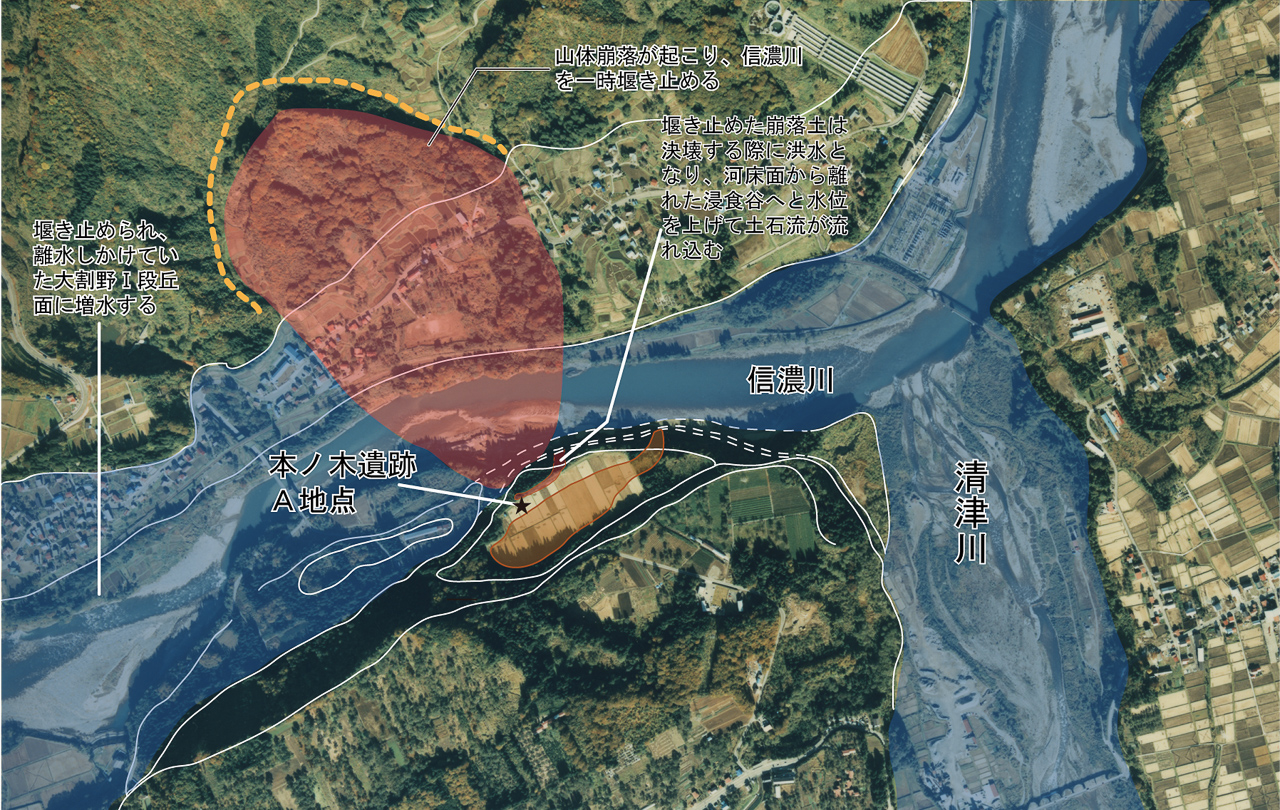 本ノ木遺跡の位置と山体崩落堆積物の関係