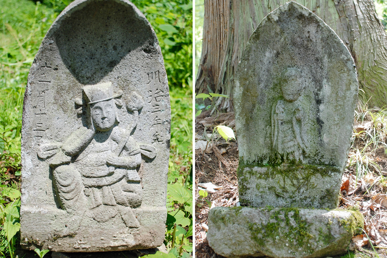 集落内や道沿いには、庚申塔や風神様、地蔵菩薩、如意輪観音、馬頭観音など様々な石造物が残されている。