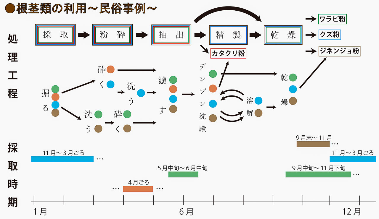 ヤマイモ(自然薯)、ユリは、そのまま調理して食べることが想定される。クズ、ワラビ、カタクリなどは、根からデンプンを取り出しての利用が想定され、その工程は以下の図の通りである。