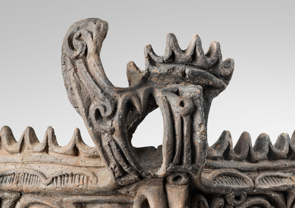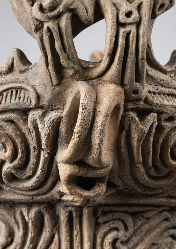 問題は、左右非対象の突起形態である。例えば、左の縦に伸びる部位を尾部と呼び、右側の端部を頭部と考えるならば、4つの突起の頭部は反時計周りに巡る(A+A+A+Aの4単位構成)である。この視点で多くの火焔型土器を観察するならば、反時計周りと時計回りがあり、大半は反時計周りである。すなわち、巡る方向は違うが、(A+B+A+B)や(A+A+B+B)と表示できるBとしての異なる突起を含む構成はない。きわめて、火焔型土器はルールに沿って作られていることに気が付く。