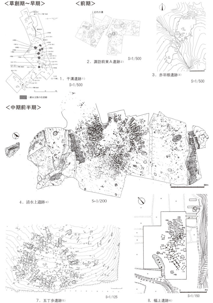 このように前期中葉⇒中期中・後葉⇒後期末葉~晩期前葉の3段階から把握された石器組成から生業活動の違いを推測することが可能であろう。すなわち、居住域をどこに置くのか、その住居の配置、集落構成上の要素とその配置は、社会と深く関わる。どのような生業を展開した社会の集落であり、その集落で使用された土器相を理解する必要がある。
