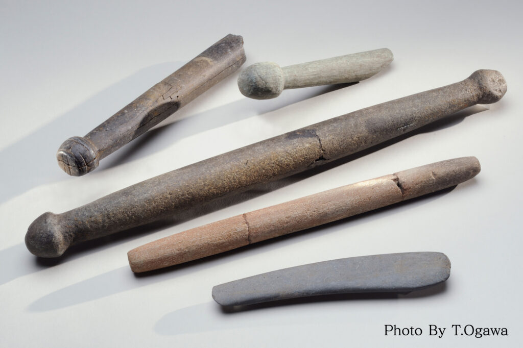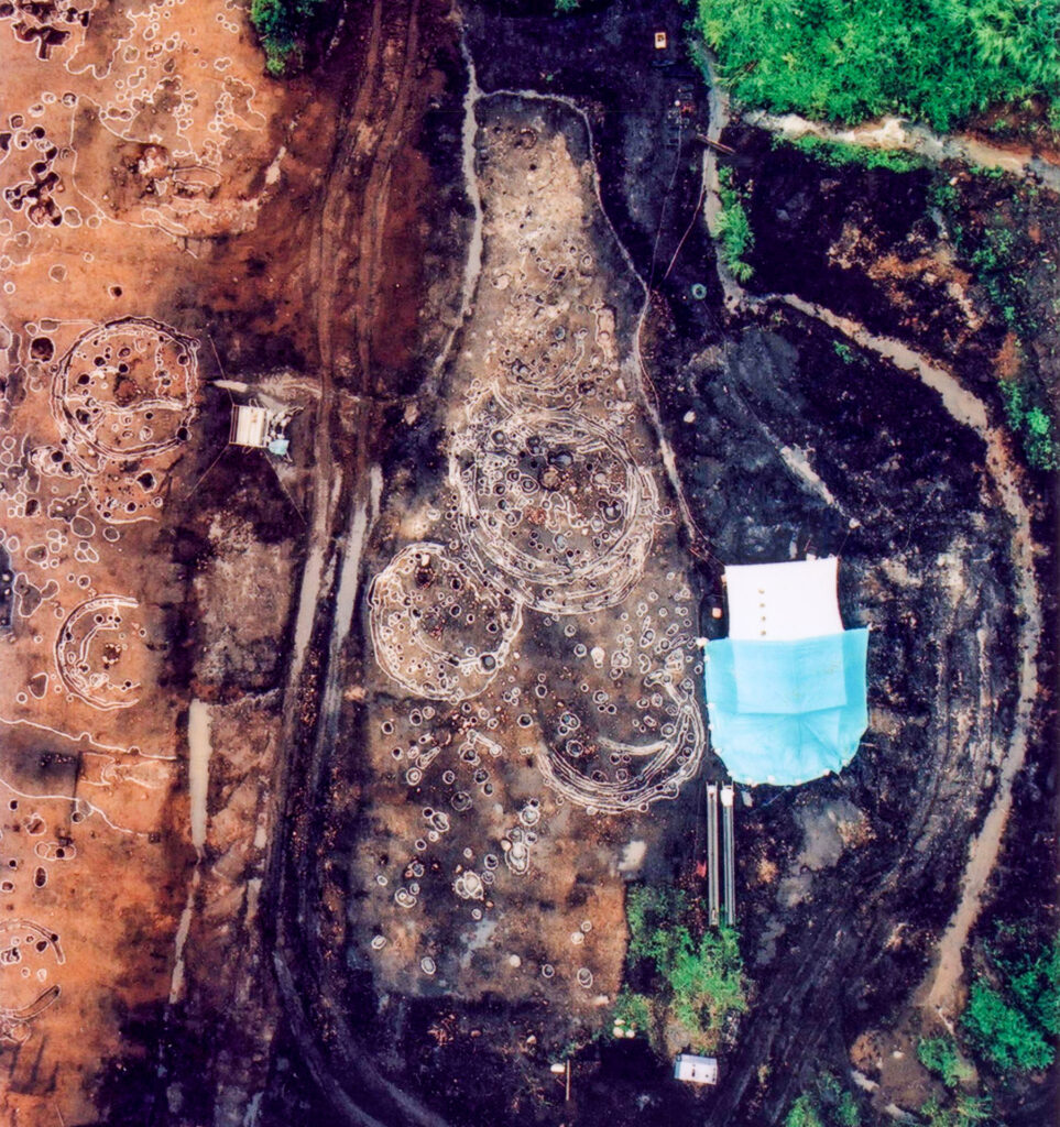 この円形を呈する竪穴住居跡群は、幾度となく、切り合う程度の移動範囲の中で建て替えを繰り返していることが分かる。広い大地に移動することなく、小川が流れる両岸に占地する必要性があったと推測される。それがトチノキの実を対象とした水晒作業と深く関わる可能性がある。さらに、興味深いことは、右岸の竪穴住居跡から焼土と炭化材に混じり、石剣や石冠などの「第2の道具」が偏在(集落全体)して出土した。この水辺で儀礼的行為が行われていた可能性がある。