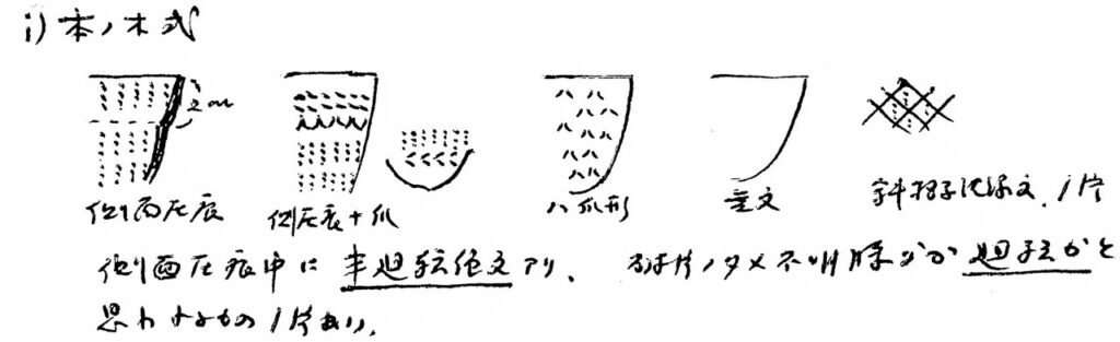 本ノ木遺跡から出土した土器群は、佐藤達夫によって、その土器相が整理され公開された。当初「特殊な土器」と呼ばれた一群である。その中核をなす土器が縄原体を回転施文することなく、押圧施文する土器であったからこそ、山内清男は特殊な土器と表現したと推測される。これら押圧縄文土器の文様帯変換部位にハの字爪形文を施す特徴がある。さらに爪形文の併施資料があったという。正位のハの字爪形文土器、無文土器に沈線で斜格子目文を描いた土器も組成していたというが、現在、確認はできない。