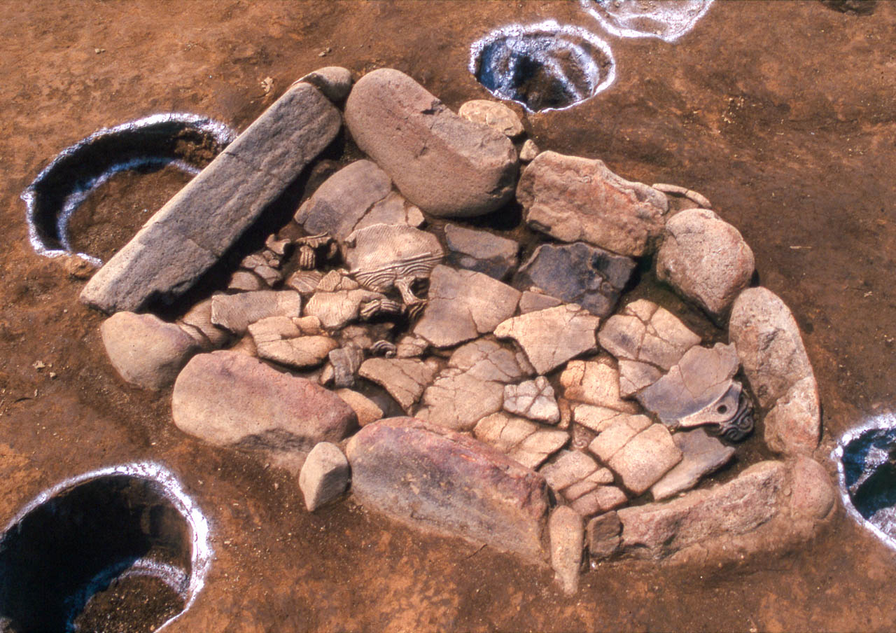 後期・晩期の竪穴住居跡の発見例は少ないが、その形態はこぶし大の礫を方形や円形に巡らし、単純化している。
