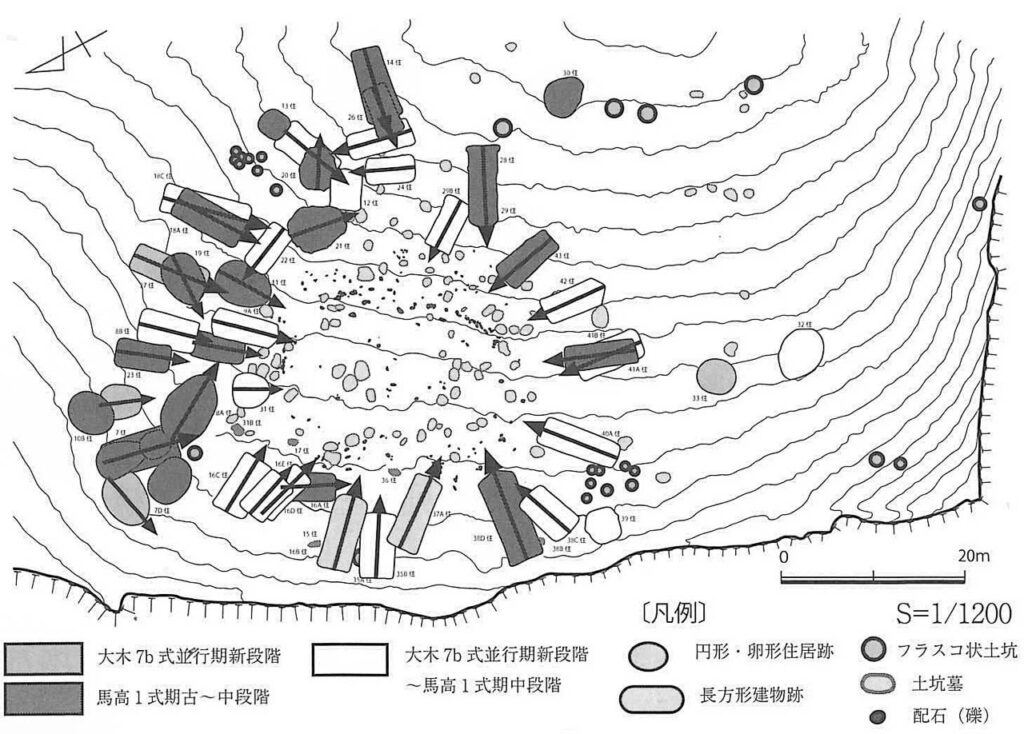 このような竪穴住居跡は、規則正しく環状に並ぶことが多くの遺跡で認められ、その典型的な有り様を南魚沼市五丁歩遺跡で観察することができる。このような環状集落は中期中葉に形成されるが、集落の終焉に伴い後期集落の実態は、いまひとつ不鮮明である。