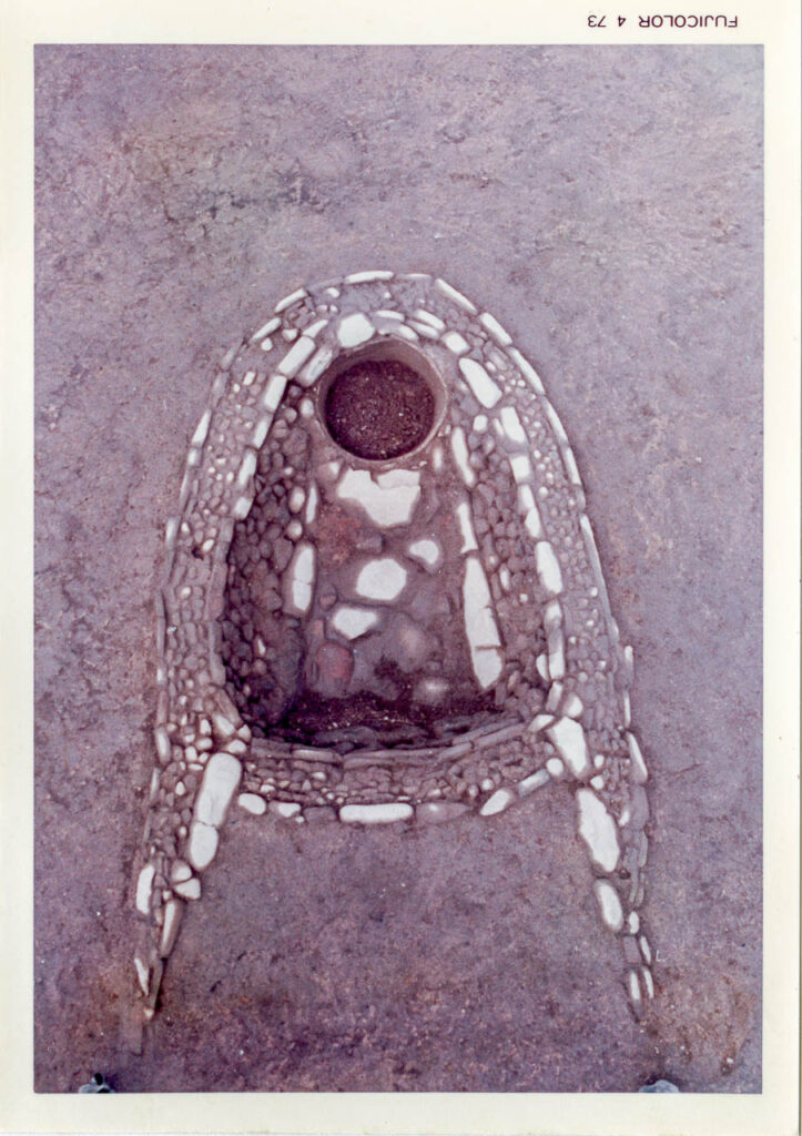 中期中葉末になると、石囲い炉の一端がさらに囲まれる新しい炉の形態が堂平遺跡で検出され、複式炉の祖形として評価する考えがある(佐藤:2011)が、その考え方には批判もある(山本:2011)。さらに中期後葉の沖ノ原式土器期になると東北地方の大木9式土器が入り込むとともに複式炉が作り出される。沖ノ原遺跡1号住居跡の複式炉は日本一美しい炉として評判である(写真1)。このような形態を示す炉は、機能として暖や明かり、煮沸・焼くなどの料理行為だけではなく、形態的意匠の意味や囲み石の間に小さな石を丁寧に埋め込む意味の精神的背景があり、それは観念的世界と関係する炉の形態ではないかとの考える研究者もいる。
