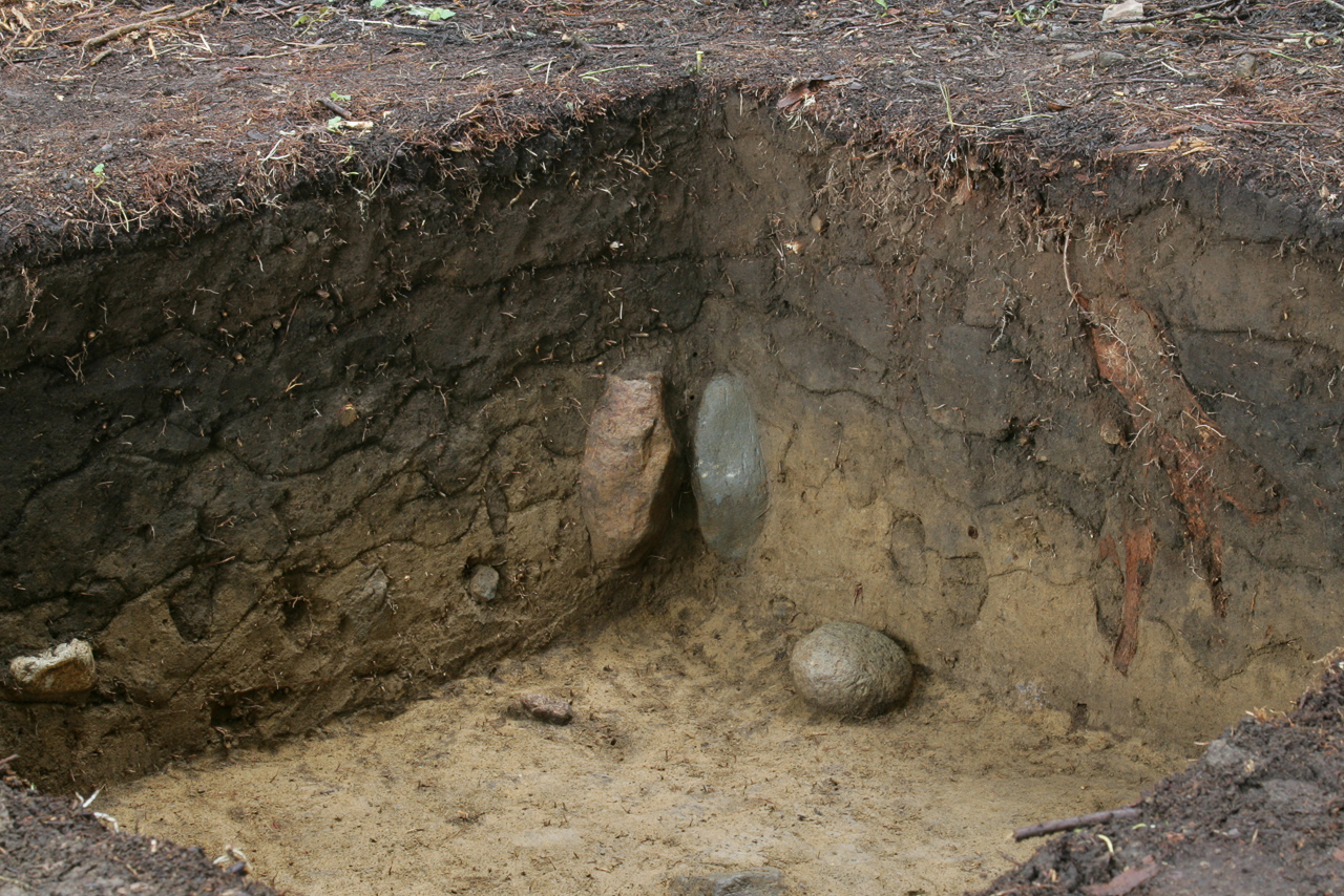 12トレンチはⅠ層からⅥ層まで整然と堆積していた。Ⅳ層およびⅥ層から押圧縄文土器群は稀薄ながら出土した。問題の立石状遺構は、その基底部がⅥ層中にあり、頭部はⅤ層を跨ぎⅣ層下部に突き出る。これら二つの立石は、赤茶けた褐色(R1)と青味かかった灰色(R2)を呈する。掘り込み遺構は確認できず、人為か自然為かについては不詳である。これら異なる色調の二つの立石は、「赤と青」を意識した象徴的な遺構であるとの意見がある。
