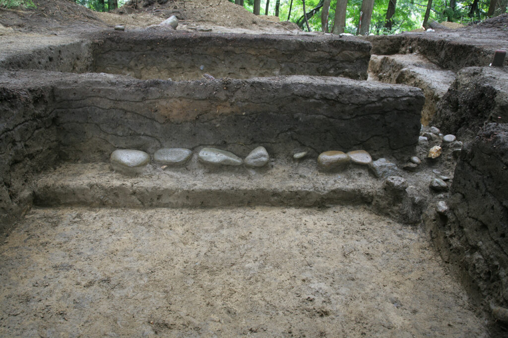9トレンチは、Ⅰ層→Ⅱ層→Ⅲ層→Ⅳ層→Ⅴ層→Ⅵ層が整然と上下関係を保ち堆積していた。Ⅱ層は栗褐色土層であり、分析の結果As-UT(浅間馬高火山灰:5000年降灰年代)が含まれていた。Ⅳ層から押圧縄文土器群が出土し、ハの字爪形文土器や自縄自巻土器などがある。列石状遺構はⅤ層層理面にあり、径20~25cmほどの亜円礫がおおむね東西方向(主軸N-85°-E)に並んでいた。漸移層であるⅤ層中からは遺物の出土は無いが、その下位のⅥ層から押圧縄文に分類される小破片土器が出土している。