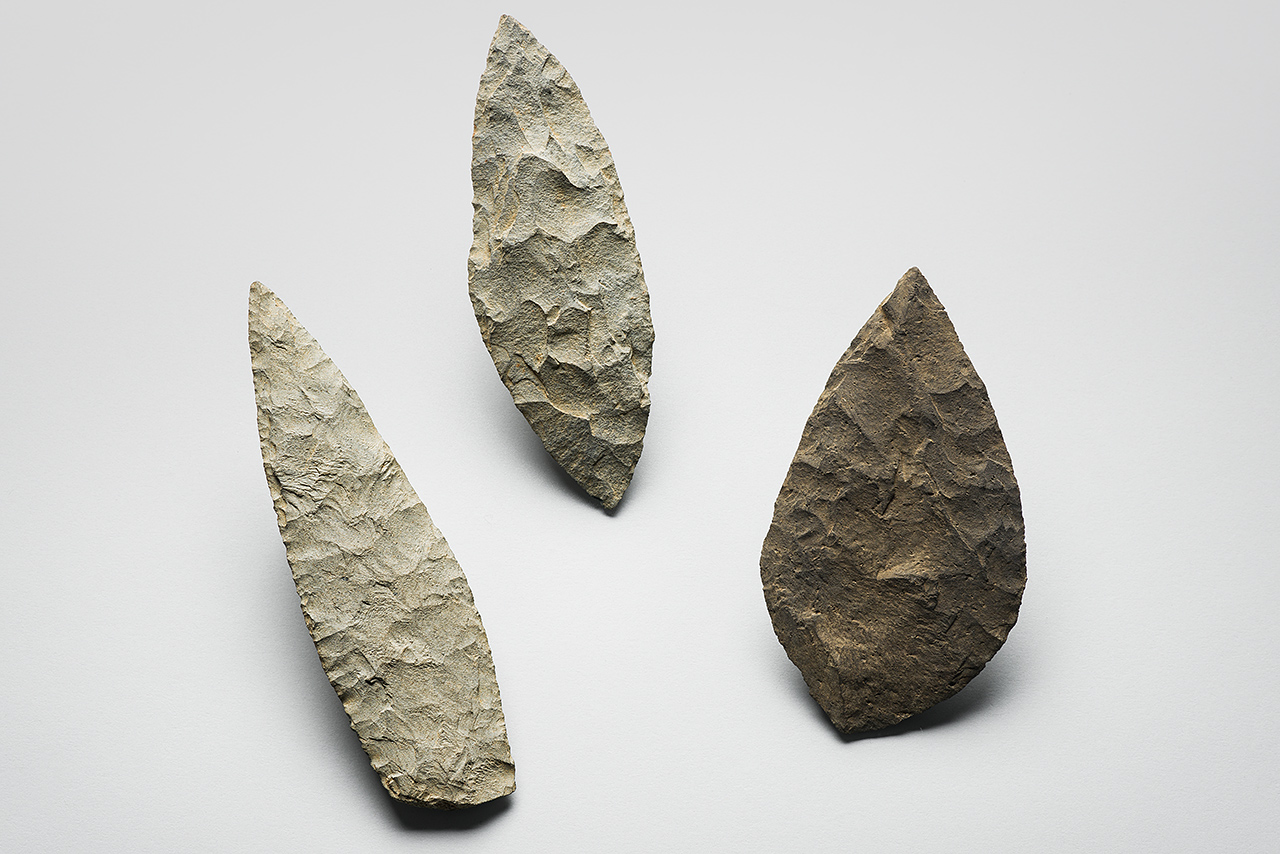 また、苗場山麓から北東約60kmに位置する魚沼市黒姫洞窟遺跡では、微隆起線文土器に伴い打製石斧や削器、掻器に混じり有舌尖頭器が共伴する。それが「小瀬が沢型」と「花見山型」の2形態の有舌尖頭器である。