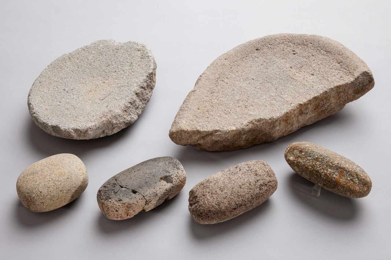「磨る」行為は、石皿と磨石のセットで行われる。獲得した食材を加工乾燥させた後に石皿の上に乾燥した食材を磨石で叩き潰して挽く行為は、石臼の遡源形態である。この対象物は、木の実だけではなく、乾燥した獣や魚などの骨付肉も叩き潰して挽くことで粉に変化したと思われる。粉での乾燥保存は重要であり、粉を混ぜて土器で煮る行為を想定する必要がある。