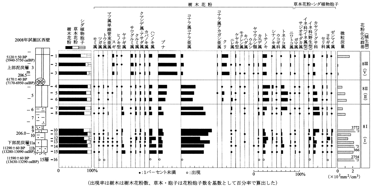 卯ノ木泥炭層遺跡の試掘トレンチにおける主要花粉分布図