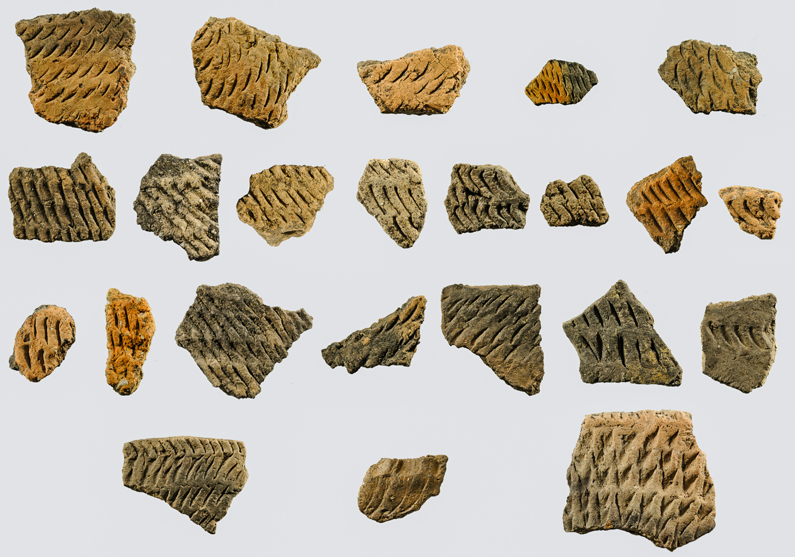 苗場山麓での爪形文土器の出土は稀である。十日町市小丸山遺跡から出土した爪形文土器は重要である。口縁部に横位2条の右傾する爪形文が観察できる(写真)。この破片左側を観察すると爪形の一部が消されるように縦位のナデ調整が認められる。柔らかい土器器面へのナデ調整で微隆起線文を生み出す手法があり、関係性が示唆される資料が存在する。
