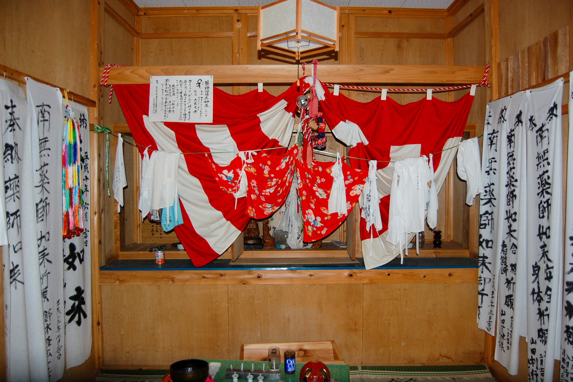 屋敷集落の薬師堂では、現在でも、治したい身体の部分を祈るために帽子やTシャツなどが奉納されている様子を見ることができる。